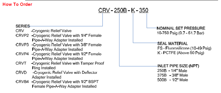 Relief pressure can not be altered or adjusted in the field. Seat and  poppet geometry combined with optimized spring ranges provide  high flow rates with minimum pressure accumulation. Compact  design and availability of a variety of inlet and outlet configurations  reduces size and piping requirements. Relief pressure can be  discharged to atmosphere or to a downstream connection. The CRV  is supplied with Flourosilicone seals for set pressures from 10 – 49  Psig (0.7 – 3.4 Bar) and PCTFE seals for set pressures greater then